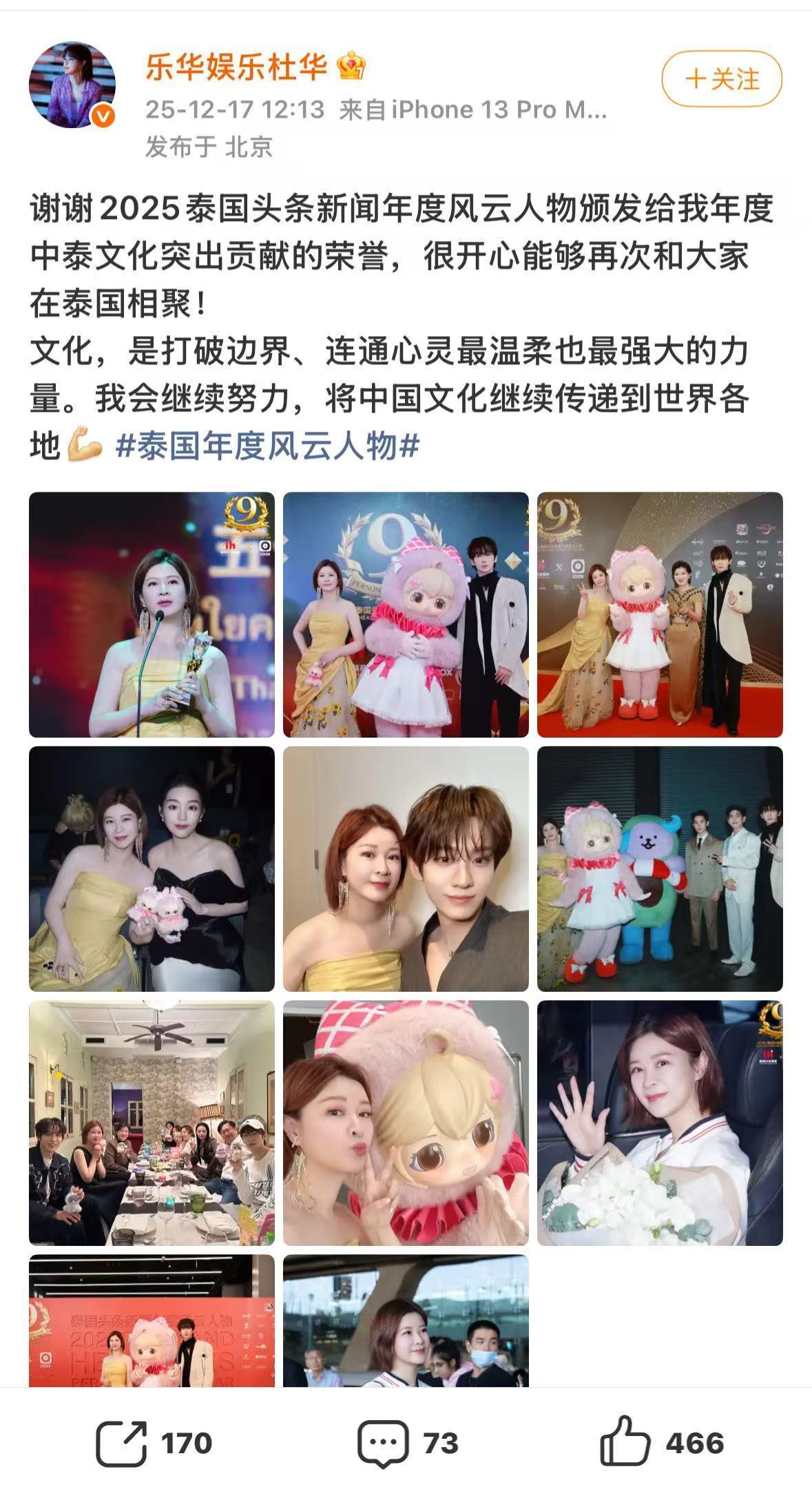 据了解,杜华这次在泰国出席了“2025泰国头条新闻年度风浪东说念主物受奖庆典”,该庆典于12月16日在曼谷举行。12月17日,杜华发文感谢,称我方在该年度受奖庆典上取得了“年度中泰文化隆起孝顺”的荣誉。