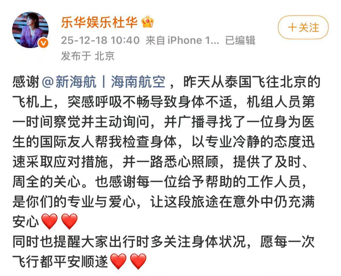 乐华文娱独创东说念主杜华发文致谢海南航空,称我方从泰国飞北京突感呼吸不畅,机组播送寻大夫为她查抄,航司回答