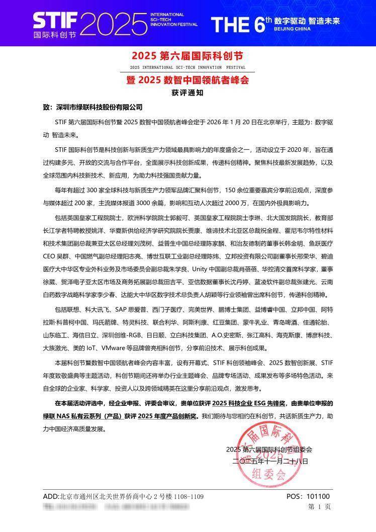 近日,STIF第六届外洋科创节暨2025数智中国领航者峰会接踵揭晓年度评比成果。绿联科技行动科技消耗电子边界头部企业,凭借在ESG实际与家具研发的双重毁坏,一举斩获 “2025 科技企业 ESG 前锋奖”,其中枢家具绿联NAS特有云系列(家具)同步获评 “2025 年度家具翻新奖”,将成为本届科创节的亮点之一。